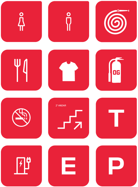 A padronização dos pictogramas, tanto em estilo quanto em aplicação, é fundamental para manter a coesão estética da identidade visual da marca. Por isso, devem ser utilizados sempre em conformidade com as diretrizes estabelecidas, respeitando proporções, cores, posicionamento e contraste com o fundo.